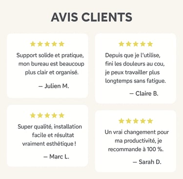 Nos supports transforment votre espace en un setup ergonomique, clair et stylé.